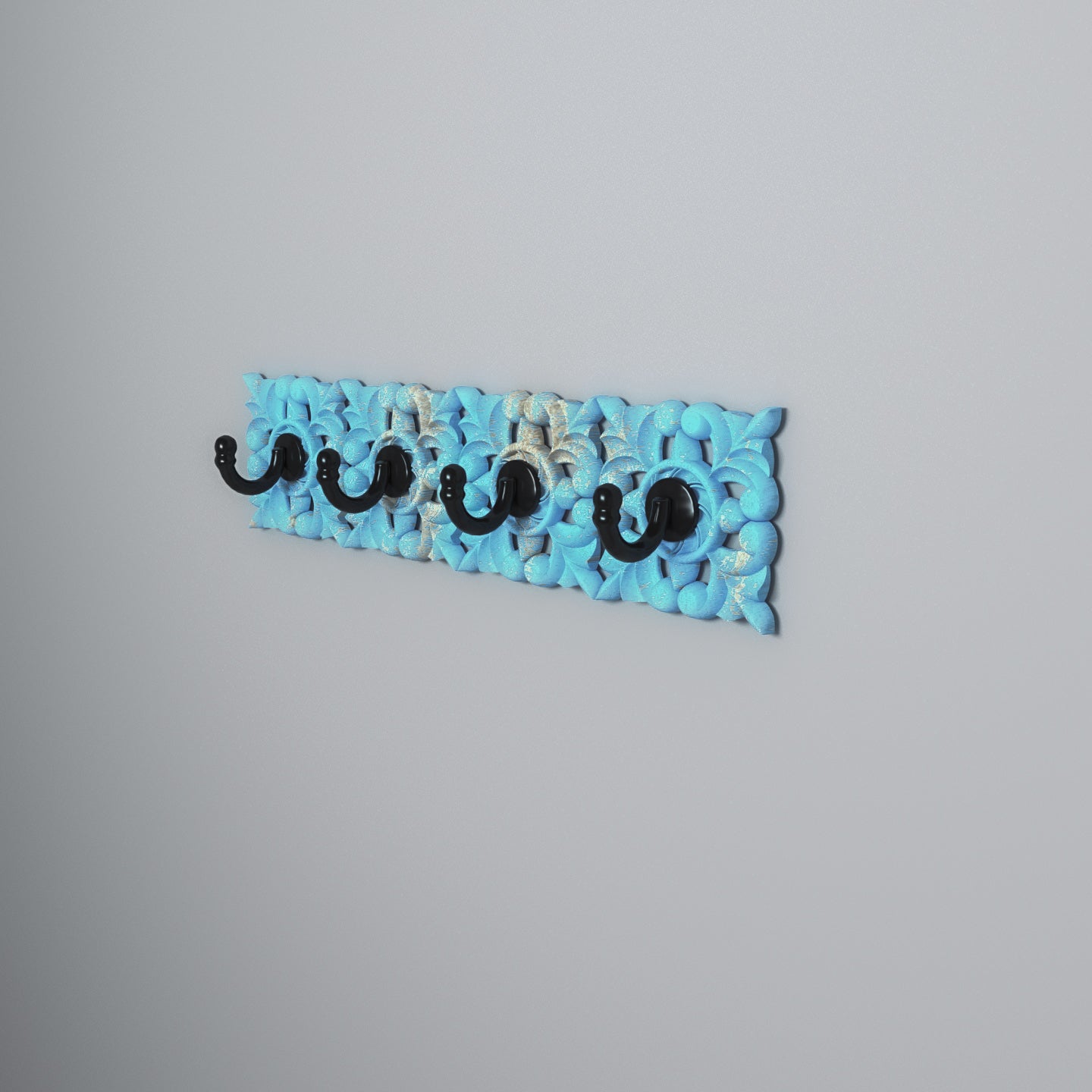 Decorative Carved Blue Wooden Wall Hook Rack with 4 Black Hooks