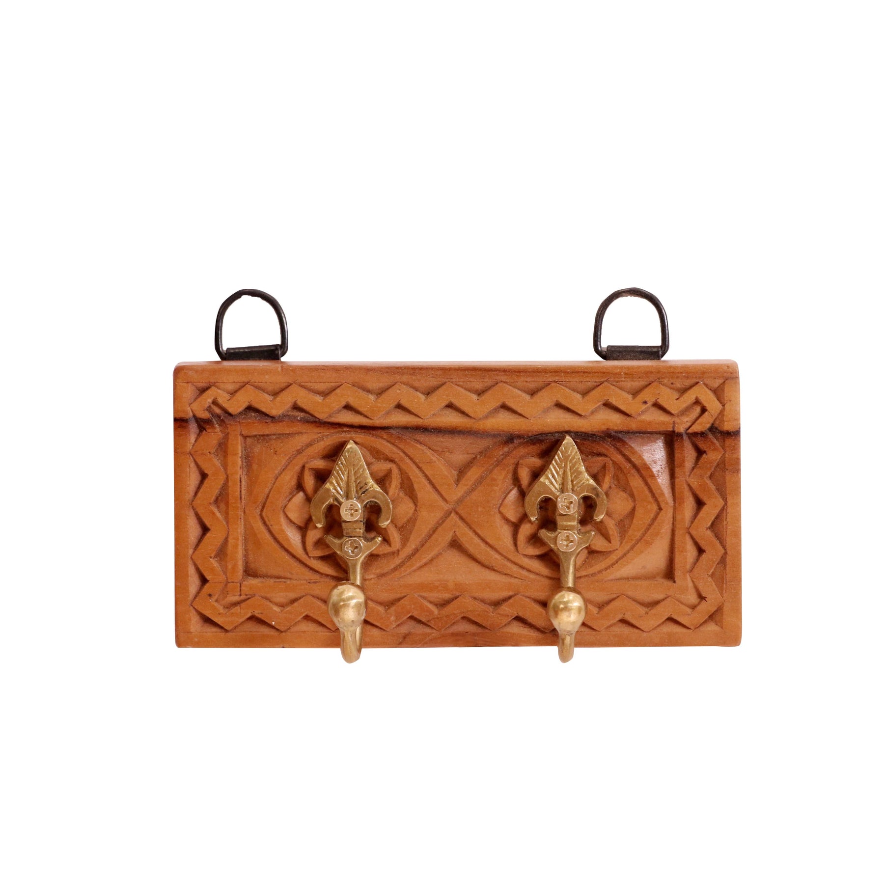 Decorative Hand-Carved Wooden Wall Hook Rack with 2 Brass Hooks