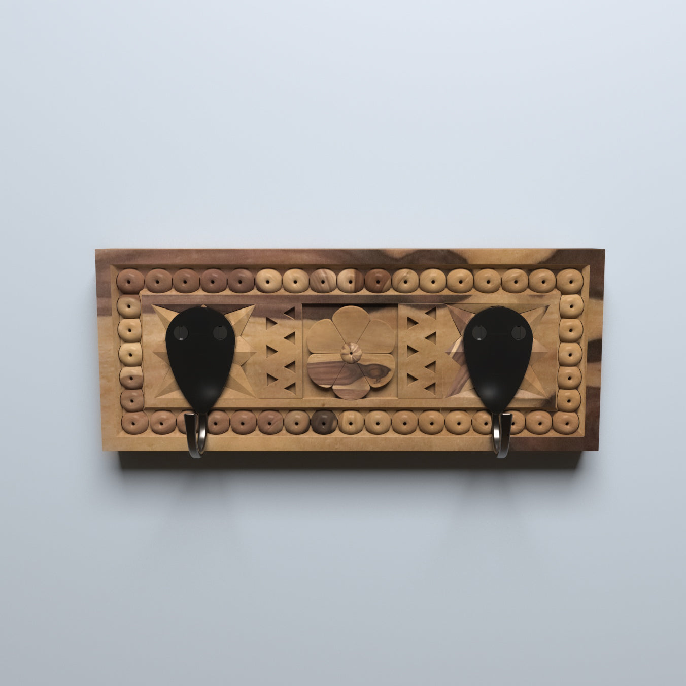 Enhance your home with this beautifully hand-carved wooden wall hook rack, designed to combine artistic craftsmanship with everyday functionality. The solid wood base features intricate geometric patterns and a central floral carving, framed by a decorative bead-style border that adds texture and character.