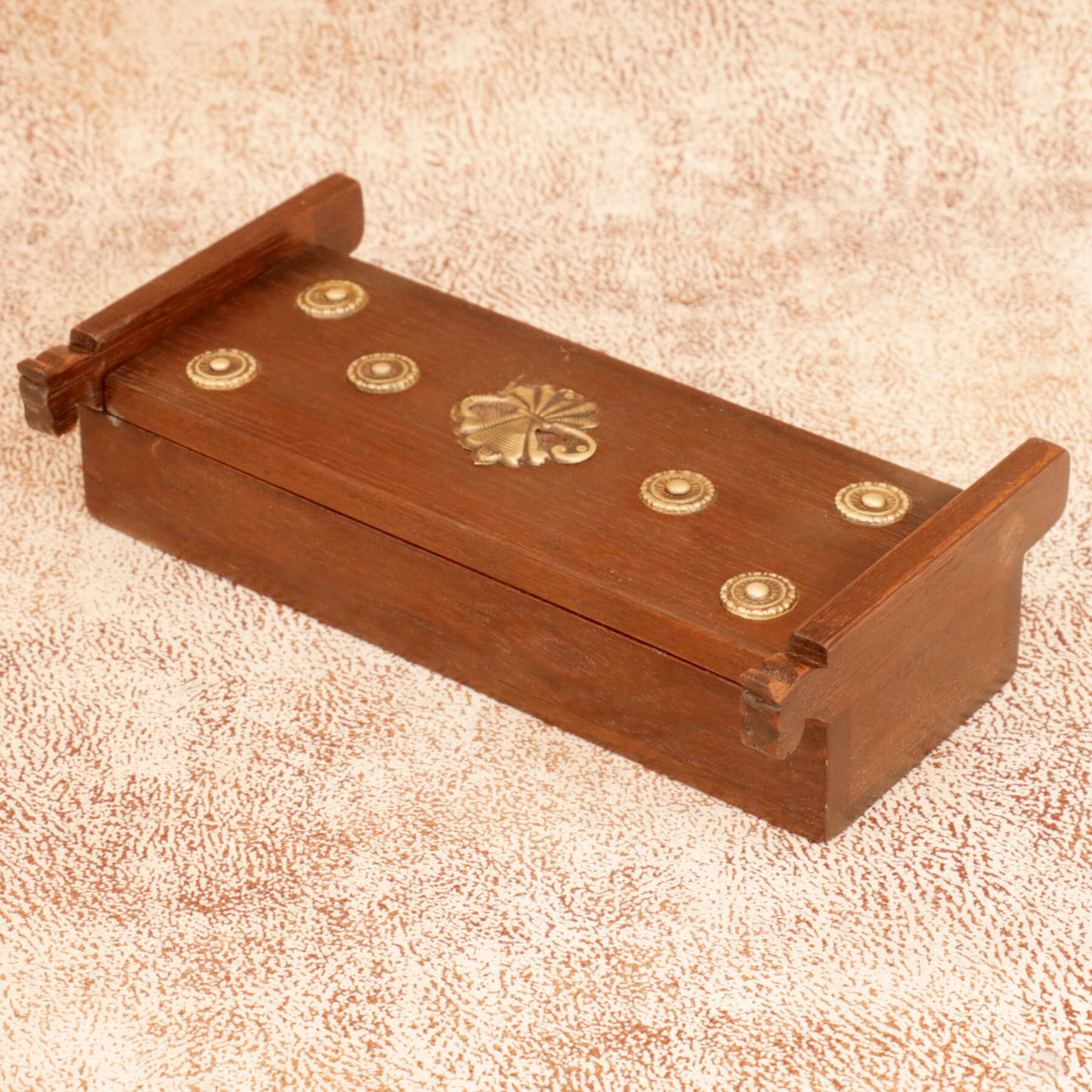Enhance your space with this elegant and compact Wooden Box, designed with a sleek elongated shape and refined detailing. Featuring a rich natural wood finish, the lid is adorned with decorative brass accents and circular motifs that add a subtle yet sophisticated vintage charm.