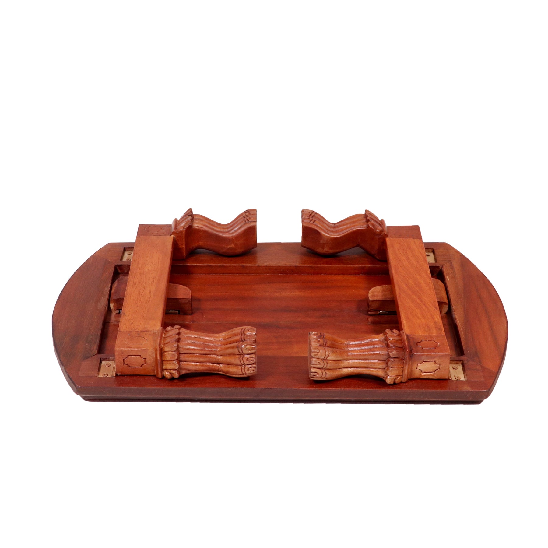 Bring timeless elegance to your sacred space with this beautifully crafted wooden pooja chowki. Featuring a distinctive curved-edge rectangular tabletop, this piece stands out with its smooth contours and refined border detailing that enhance its traditional appeal.